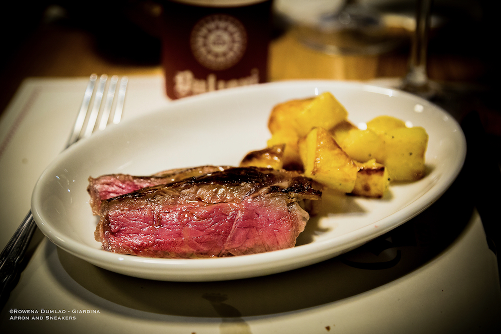 Some recommendable pintxos that I’ve tried are: Tonno di coniglio e pepperone arrosto (tonno of rabbit and roasted peppers, a Piemontese appetizer of slow-cooked rabbit meat then conserved in an abundance of oil and garlic), fungo cardoncello e cicoria ripassata (cardoncello mushroom and sautèed chicory), burrata affumicata e pomodoro arrosto (smoked burrata and roasted tomato). A taste of a couple of their tapas is with the verza e salsiccia di fegato (savoy cabbage and liver sausage) and Fiocco della Tuscia alla piastra, verdure e mosto cotto (grilled Fiocco della Tuscia, vegetables and cooked must). For an excellent plate of pasta, the pappardelle al ragù di frattaglie (pappardelle with offal ragù). As for the meat main course from Bottega Liberati, Bistecca di manzo e patate arrosto (beef steak with roasted potatoes), cooked to perfection, tender and tasty. Concluding the dinner with a low key dessert, sbrisolona alle mele (apple crumble) was simply perfect.